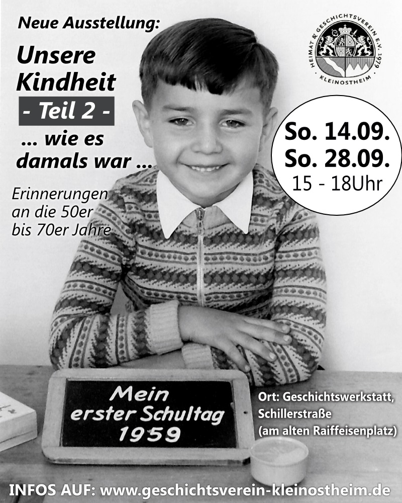 Kommen Sie doch in unsere Ausstellung! Der zweite Teil der Ausstellung „Unsere Kindheit – wie es damals war“ wurde an der Kerb eröffnet und ist am Sonntag, den 14. September zwischen 15.00 Uhr und 18.00 Uhr in der Geschichtswerkstatt in der Schillerstraße (hinter der Bücherei) zu besichtigen. Auch die Chronik ist vor Ort zu erwerben.